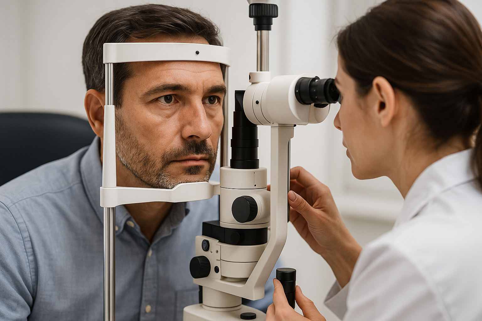 - فحص صحة العين الخارجية: باستخدام المصباح الشقي (Slit Lamp)، وهو مجهر خاص يسمح بفحص تفصيلي للجفون، الملتحمة، القرنية، القزحية، وعدسة العين، للكشف عن علامات جفاف العين، الالتهابات، أو إعتام عدسة العين (الماء الأبيض).