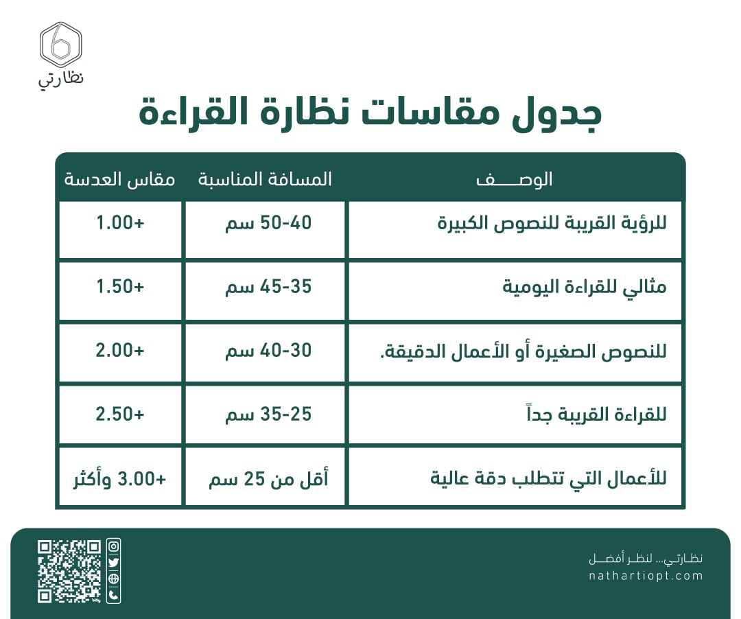 +1.00 40-50 سم للرؤية القريبة للنصوص الكبيرة. +1.50 35-45 سم مثالي للقراءة اليومية. +2.00 30-40 سم للنصوص الصغيرة أو الأعمال الدقيقة. +2.50 25-35 سم للقراءة القريبة جدًا. +3.00 أقل من 25 سم للأعمال التي تتطلب دقة عالية. يُفضل دائمًا زيارة طبيب العيون لتحديد المقاس بدقة إذا كنت تعاني من ضعف نظر أو اختلاف بين العينين.