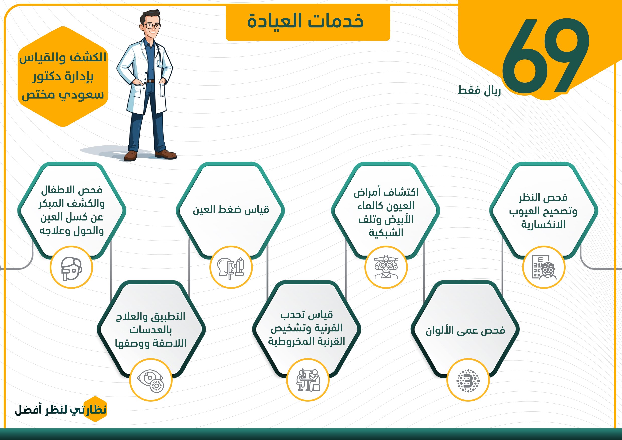 عيادة "نظارتي" تقدم مجموعة متكاملة من الخدمات لضمان صحة العين وسلامة البصر، بإشراف فريق طبي سعودي متخصص وبتكلفة تنافسية قدرها 69 ريال فقط. نحرص على توفير أفضل التجارب لعملائنا بأحدث الأجهزة الطبية وبعناية فائقة، وتشمل خدماتنا: